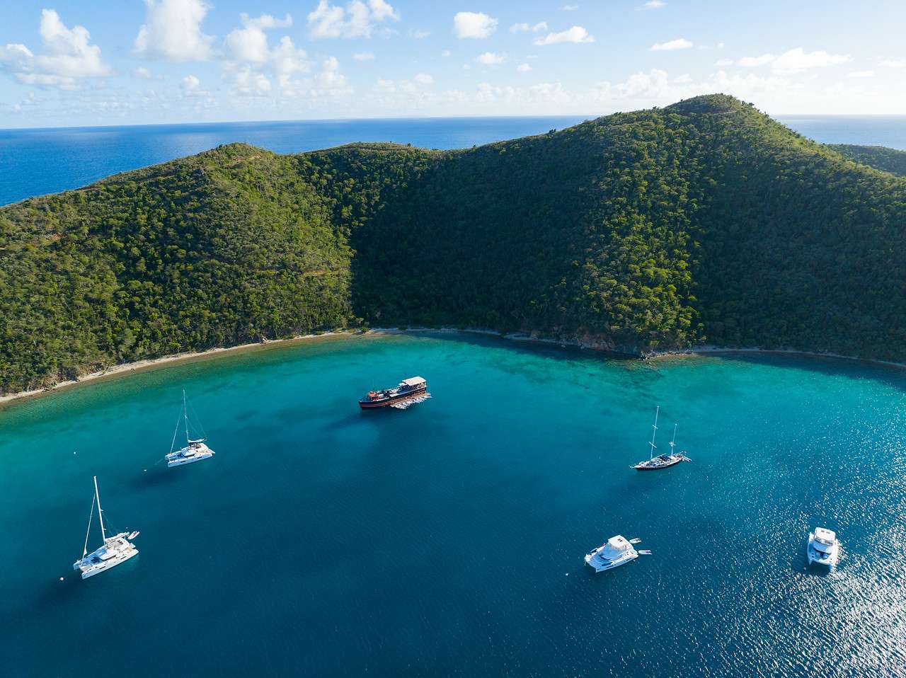 Set course for Jost Van Dyke and split your time between Great Harbour and White Bay, with a side trip to Sandy Cay. Expect lively beach bars, soft-sand swimming, and easy moorings in well-sheltered harbors.