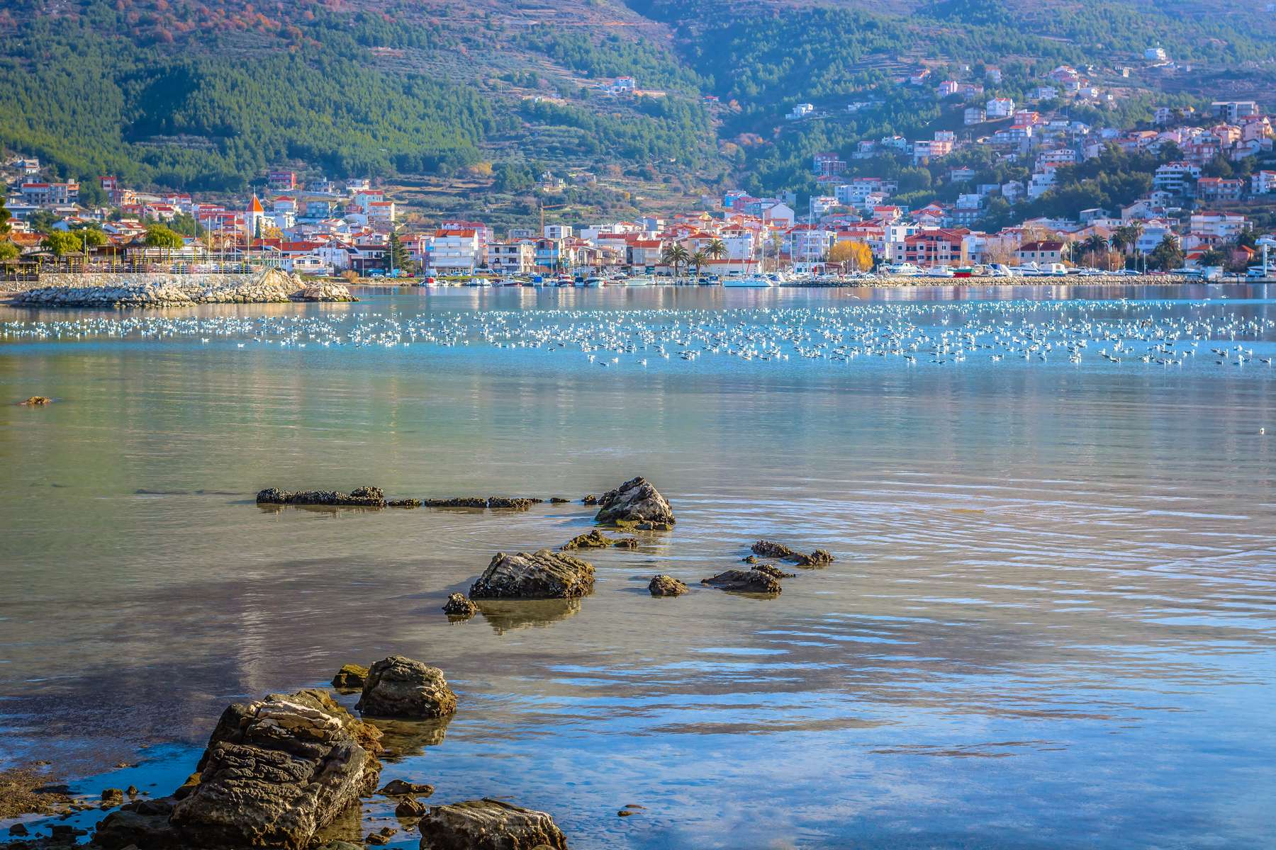 Skirt the mainland to Podstrana’s long strand just south of Split. Enjoy an easy beach day with the option to pop into the city for history and larger provisioning.